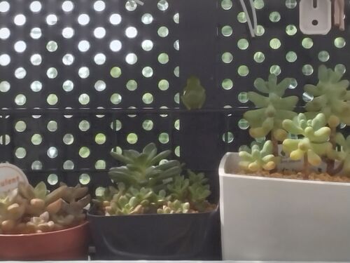ある日の訪問者 強い雨が降った日の夜 ベランダ多肉の様子を見ようとカーテンを開けたら窓に引っ付いていたカエル 多肉植物の緑と似ているので なんだか違和感のない後ろ姿?のカエル そこは多肉植物を一望できる一等地じゃないかい!? 丁度いい場所に居座…